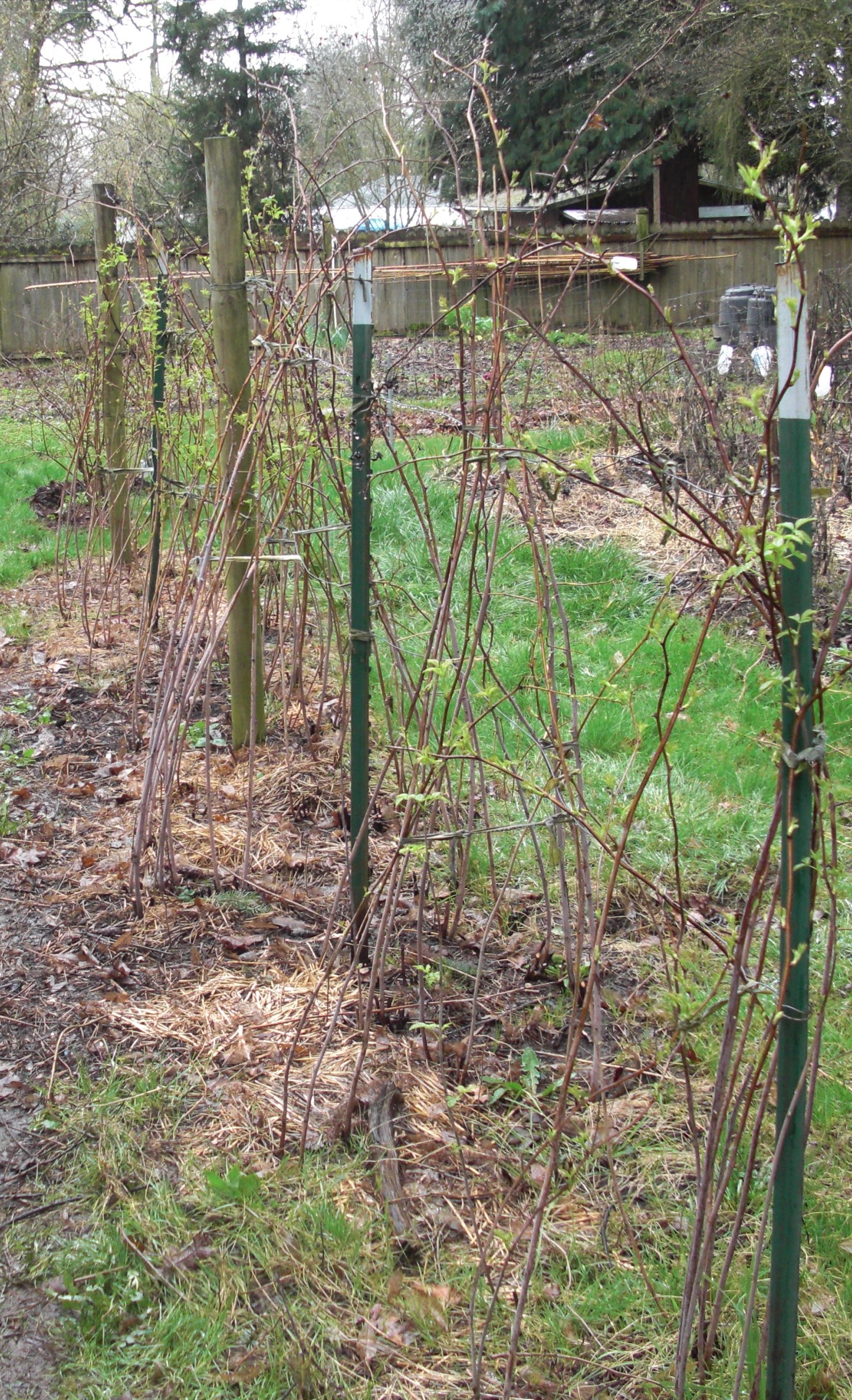 Usually I take care of cutting out old raspberry canes in the fall. This year, for whatever reason, it didn’t get done. It was a nice warm day today, so I got out the pruners and tidied up the rows. I cut out all the two-year old canes and tied last years canes to the trellis.