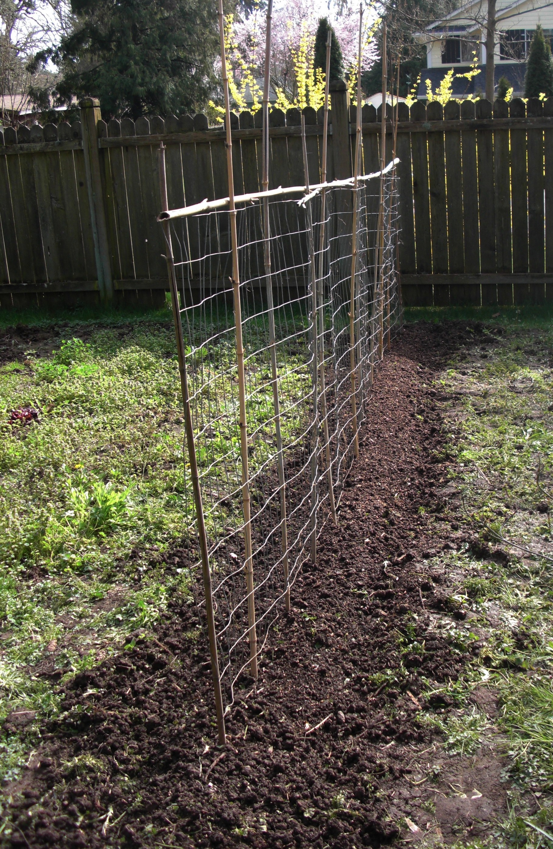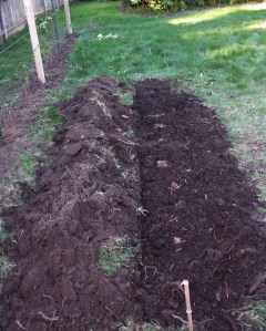 First on the list was to get some asparagus into the ground. I should have done this years ago – in fact I tried a couple of years ago but I didn’t do it right. The good garden space is always in demand and asparagus needs a permanent location. Last time, I had some space just on the north side along the fence. I dug the crowns in too deeply, the sun never shone on the ground behind the fence, and the crowns never grew. So this year I’m trying another not totally desirable location under a big fir tree, but compromises must be made. This was an area of lawn, so I dug out the sod and then dug a another shovel depth to loosen the soil and added two big wheelbarrows of compost to the trench. I worked all this in and planted the crowns to be a couple of inches below the surface with the roots going deeper.