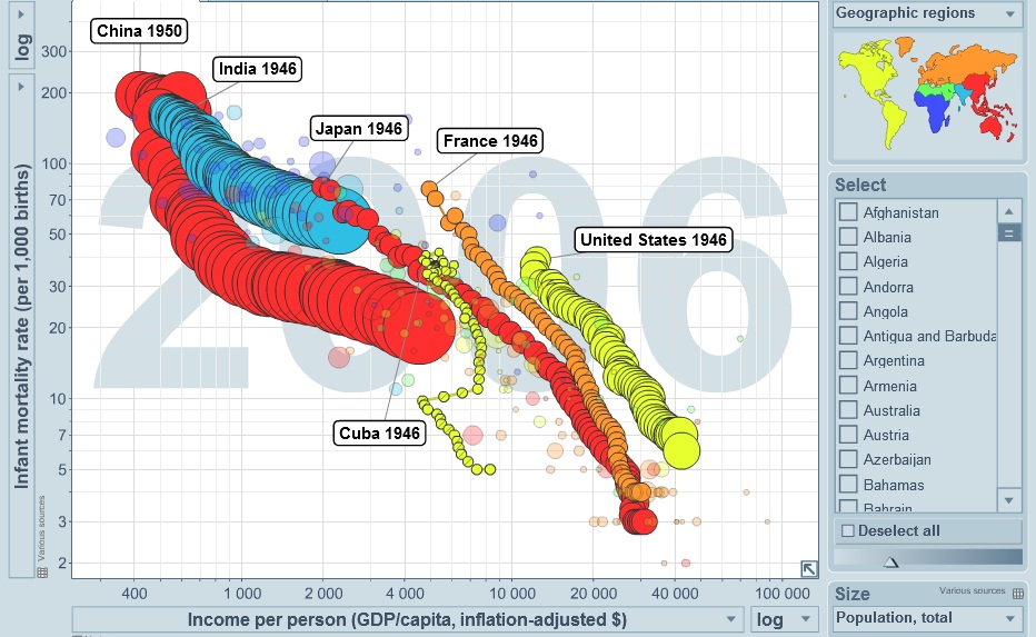 After you play with the Gapminder graphs for a while, you begin to realize how much progress has been made in terms of overall health and education throughout the world. There is not nearly the large differences between haves and have-nots today compared with forty years ago. In absolute terms, health and education indicators are much improved worldwide.