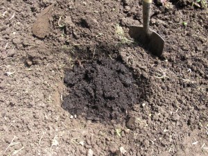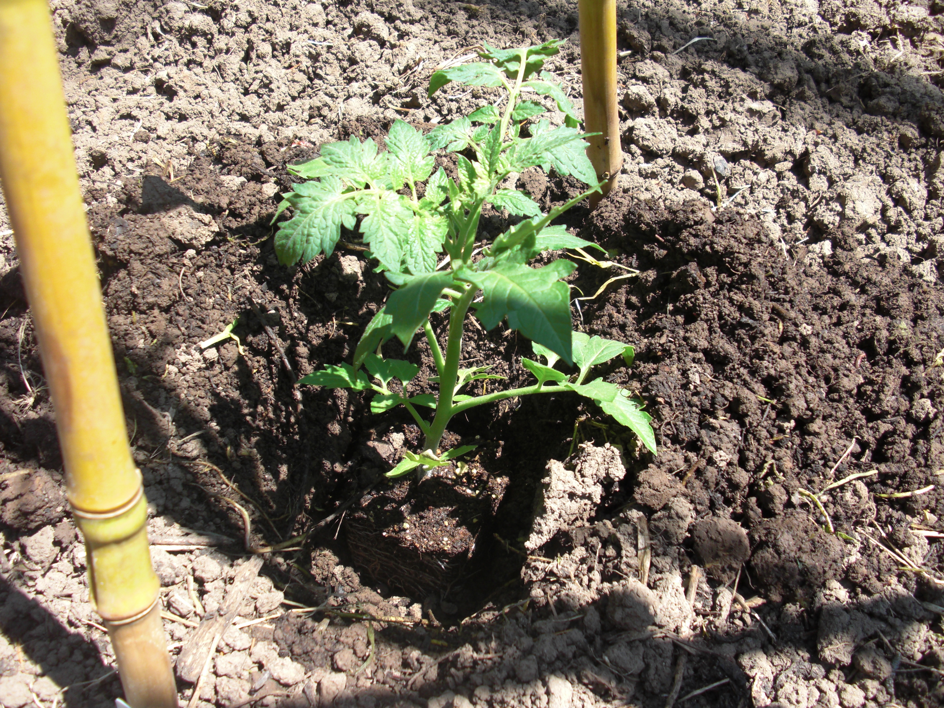 So with the preparations already done, the plants went in the ground – up to their necks! Tomatoes will develop roots all along the stem and the deep roots will see more consistent moisture and be able to get at all of the compost I put in the bottom of the hole.
