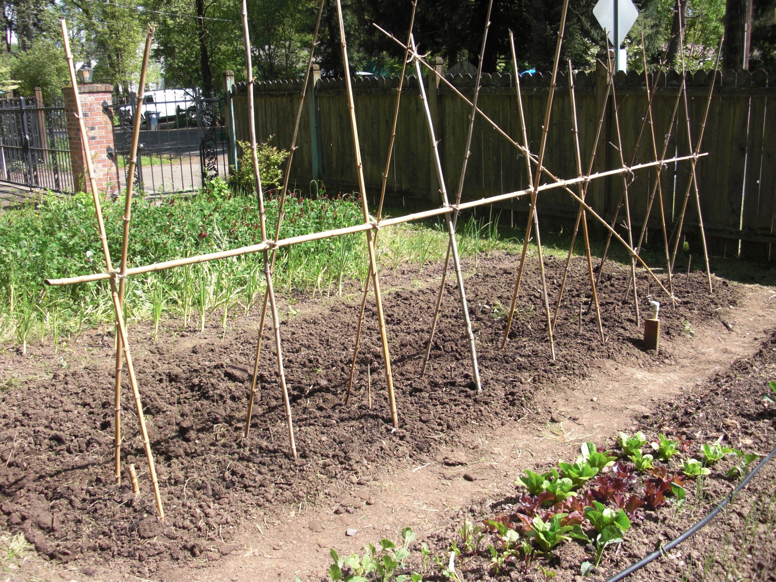 I prepared the tomato spot last weekend. Tomatoes like to be deep rooted and will thrive on compost. Each hill received three nice shovels full of compost in a hole dug a “shovel length” deep with soil loosened even deeper. There are lots of methods for trellising tomatoes. We happen to have a nice bamboo patch in our back yard that always needs thinning. Hence, I use a lot of bamboo for garden architecture. I set two crossed poles for each plant and then tie the row together with a horizontal pole at the cross point. The key to structural stability is a diagonal pole to make the whole structure rigid. All the cross points are tied with twine.