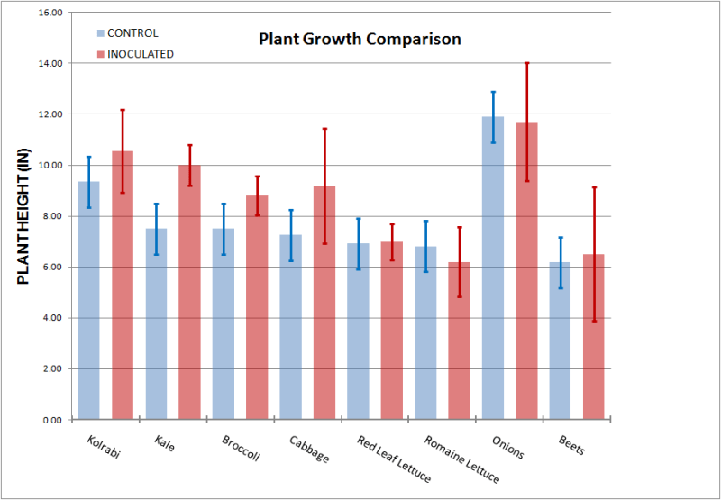 After staring at the data a little bit, I realized that although several plant varieties showed no statistically significant difference, all the Brassica – the kohlrabi, kale, broccoli and cabbage, were doing better in the inoculated bed. The differences are big enough that there is almost no chance it’s just a statistical fluke, especially with the kale and the broccoli.