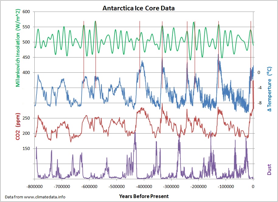 The major features of the temperature data can be correlated with variations in solar flux associated with periodic changes in the earth’s orbit and tilt of the poles, known as Milankovitch cycles. However, the climate forcing due to orbital changes is the result of the sum of symmetric functions, and as a result, qualitatively looks the same if time were to run either forward or backward. Not so for the actual climate data. The Milankovitch oscillations appear more like triggers that release pent-up climate tensions. The climate has its own dynamic behavior that is not merely a linear response to external forcing. The rapid temperature rises suggest powerful feedback mechanisms that reinforce the switch to warmer climate. The heat trapping CO2 concentration, which mimics the temperature data, could certainly be one of these mechanisms. More solar warming as reflective ice sheets recede, leaving behind heat absorbing dark water and land, must also be important.