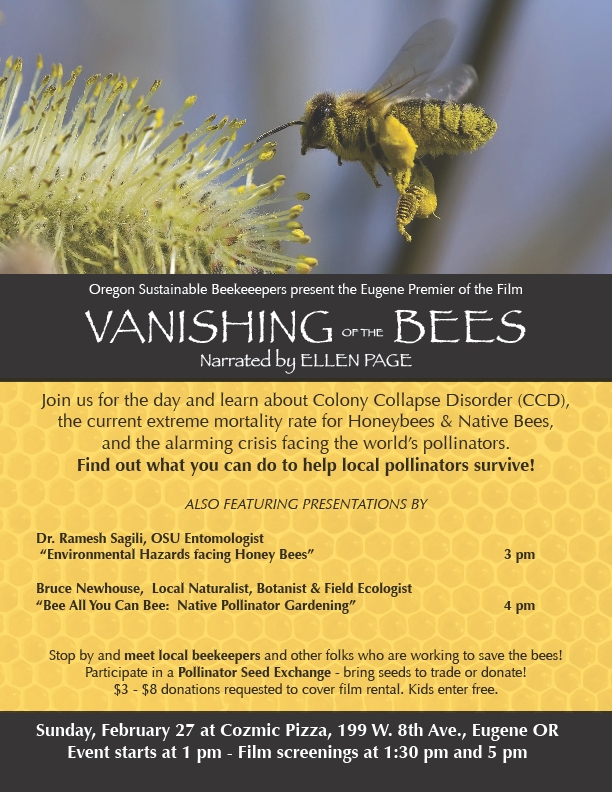 Coming up in Eugene on February 27th, there will be a great opportunity to get to know more about the plight of the bees. There will be a showing of the film Vanishing of the Bees along with presentations by local experts and beekeepers. I’m going to bring a little of my crimson clover seed to give folks who want to plant some bee forage, and there should be other seed available as well. It’s a chance to learn a little more about the problem insecticides and what we can do about them, and a chance to talk to local beekeepers about how to keep our insect friends flying.