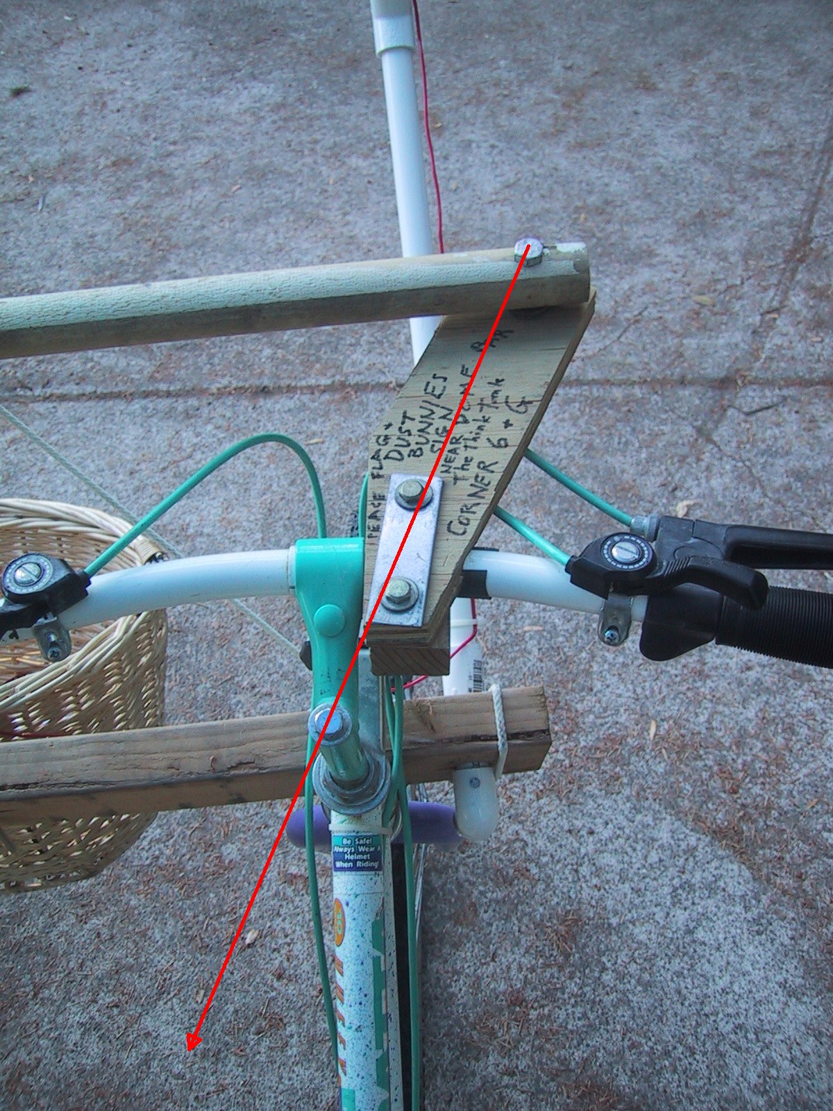 My steering tie rod was just another piece of wood, in this case a piece of closet rod. To make the tie rod brackets, I just fashioned clamps from wood and bolts that attach to the handlebar. A pretty robust clamp can be made by clamping together a couple of pieces of wood and drilling a hole the same size as the handlebar along the joint – similar to the seat post clamp. I reinforced the clamp with a couple of metal straps. For acceptable performance, all you have to do is make sure the distance between the tie rod pivot and the steering head stock pivot is the same for both sides, and line up those two pivots so they point to the center of the bike midway between the rear wheels. (Note the arrow in the photo.) For the tie rod pivots, I just used bolts with extra washers and a crimp on the nut so it wouldn’t come loose.