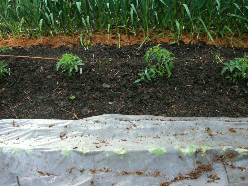With another cool wet week predicted, I’ll be leaving the row cover over those beans for a few more days. Meanwhile, the tomato starts are doing pretty well – weather considered. They seem to tolerate cool and damp better than they are often given credit for. The problem for the tomatoes is that they will not set fruit until the night temperatures get warmer. So, they too, would probably benefit from row cover.