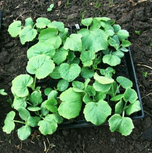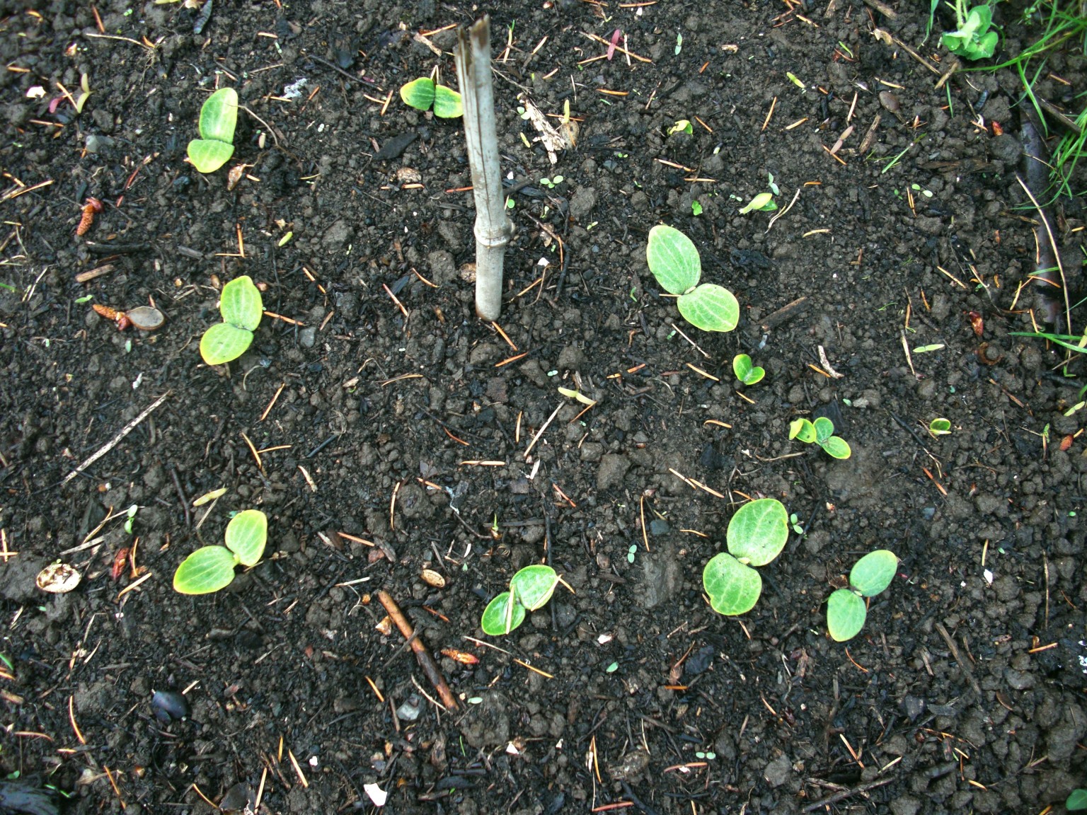 Eventually I was able to work up the ground for some of the squash hills. Although a little late, I seeded the hills and placed row cover over much of them as well. They are just popping up now, along with the confounding compost seedlings. But I have my methods for detecting the interlopers. I plant eight seeds in a hill in a square pattern. Can you tell which ones don’t belong?
