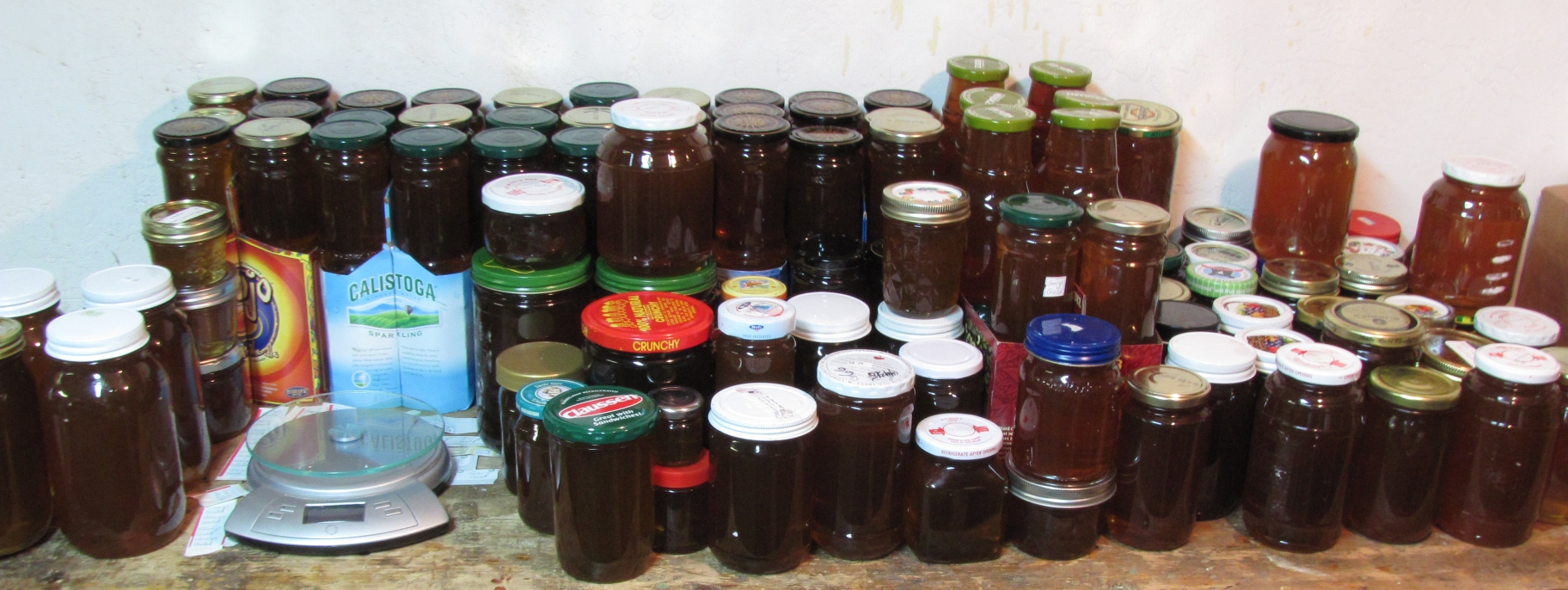 Most of my honey ends up as gifts or barter, so I just use whatever jars I can find. Several friends save jars for us all year, and by the time we are ready to extract, there are copious bags of jars of all sizes for the crop. It’s a job in itself to remove the old labels from the jars, to wash them and match up the lids. Ellen and friends helped out with this process.