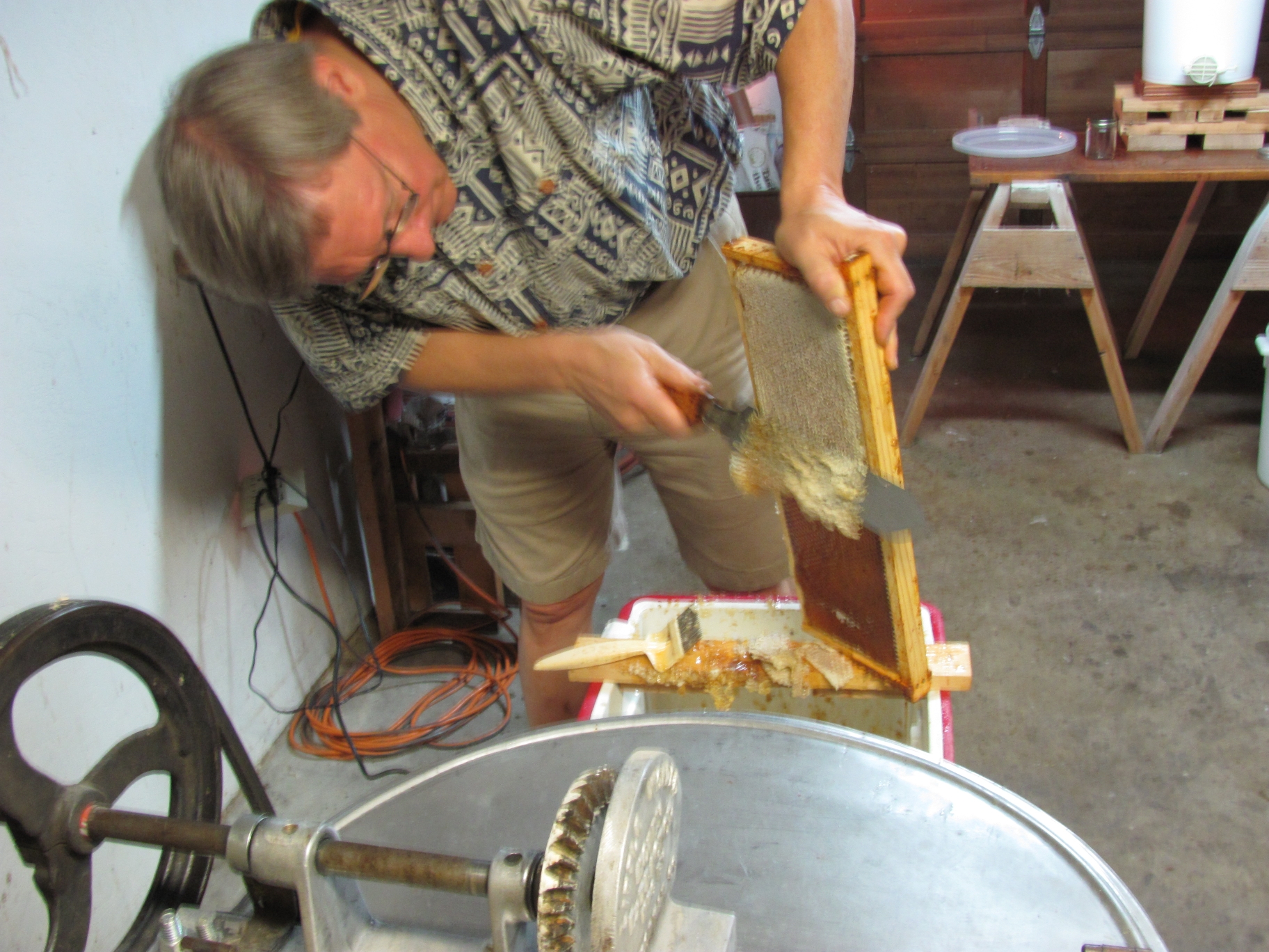 The key piece of equipment for extracting honey is, of course, the extractor. I picked up a third-hand four-frame home-motorized extractor from a beekeeper friend about fifteen years ago. With a little TLC, a nice new table for it, and a little monkey business with a washing machine motor, I have a serviceable piece of equipment. The motor has a “wash” speed for turning the heavy frames, and then a “spin” speed to clean them out.