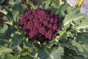 Each variety has its own internal time clock for when to turn on the new spring growth. It doesn’t much matter how big the plant is; when it’s time to flower, it will do what it can with what it has. This is the reason that timing can be so important when growing overwintering vegetables such as cauliflower. If the plants don’t have sufficient size when they stop growing as winter closes in, you will get tiny cauliflowers in the spring. In my shady yard it pays to start early. The Purple Cape cauliflower pictured above was seeded about a year ago, the one pictured below was seeded in May or June, the “normal” time to start them around here, but not if you plant them in the shade!