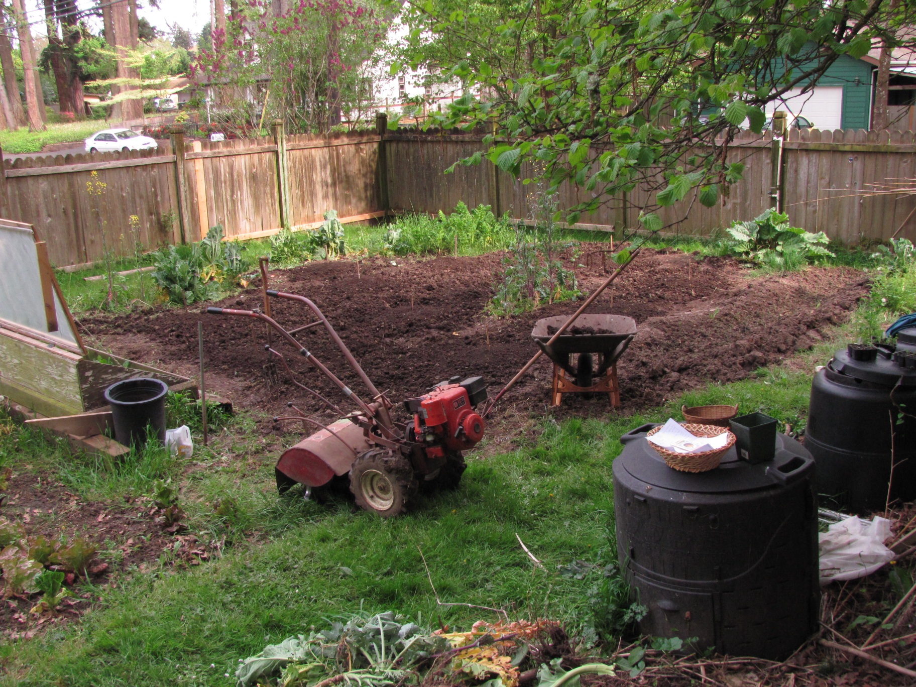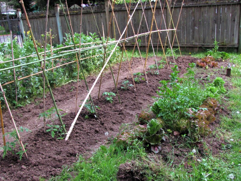 The tomatoes have to go in soon. Two rows usually seems right, but the spot where they are supposed to go really doesn’t accommodate two rows. The Paul Robeson tomatoes that I started in February are about to outgrow the cold frame. A bike trip to the farmer’s market yields the other varieties I like. Should I plant them out or hold them in the cold frame for another week or two? I build the row trellis and the sunshine convinces me to set in the ten plants that I have room for. Maybe next week inspiration will tell me where the rest can go.