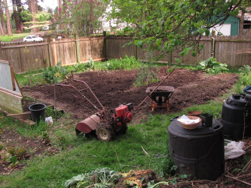 Next is the squash patch. There are still some cauliflower and kale growing there. The kale provide snacks as I till the ground around them. They don’t have much time left, but I manage to build my squash pattern, squeezed to six feet between hills in all directions, such that they can stay a little longer. I get twelve squash hills in this corner of the garden. Not bad, but not enough.