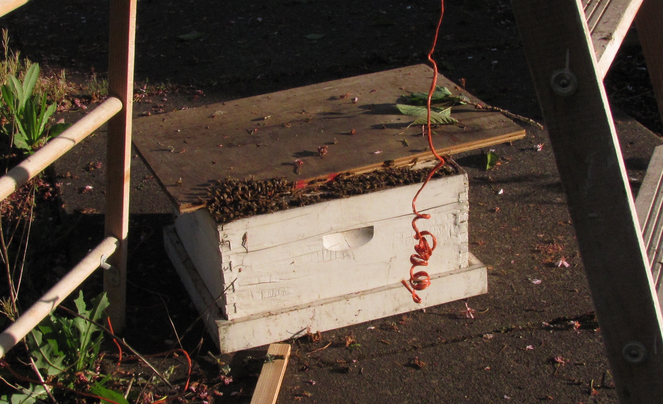 When most of the bees are in, I carefully lower the box to the ground and continue to wait for the rest of the bees to find their way. I break off a few small branches with clusters of bees and bring them down the ladder. The bees eagerly disperse into the new colony. Finally with still a few hundred bees in the tree it’s time to go home. I slide the cover over the box, put the new colony in the van, and head home. The stragglers will eventually figure out they missed the boat and return to their old colony.