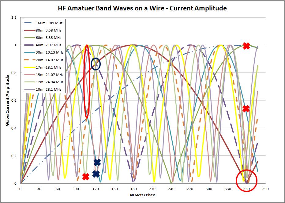 The chart above plots the standing wave amplitude of waves on a wire that all start with zero amplitude on the left side.  If you cut the wire where you again have an amplitude zero, a standing wave would be supported on the wire.  Arbitrarily, I chose to express length as the phase on a 40m long wire.  Note that many of the bands are close to resonant at the 360° (40m) point.  The exceptions are the red crosses at 360°, namely the 160m, 60m, and 30m bands.  An antenna made this long will completely fail with the 160m and 60m bands, and will have some difficulty on 30m.  In fact, 30m is problematic in general because the actual ham band is not a very close multiple of the others, so will often require more of a compromise.  The lowest resonant band on the 40m wire is the 80m band, hence a wire this long is classified as an 80m dipole.  If you didn’t have enough space for the 80m antenna, you could consider stopping at the 180°  point on the chart, where again there is another convergence of zero amplitudes for the 40, 20, 15, and 10 meter bands; or maybe you could stop at 250°  and attempt to capture the 60, 15, 30, and 12 meter bands.  Picking the zero convergence selects the overall length of the wire, but we still have to pick the dividing point where we drive it.