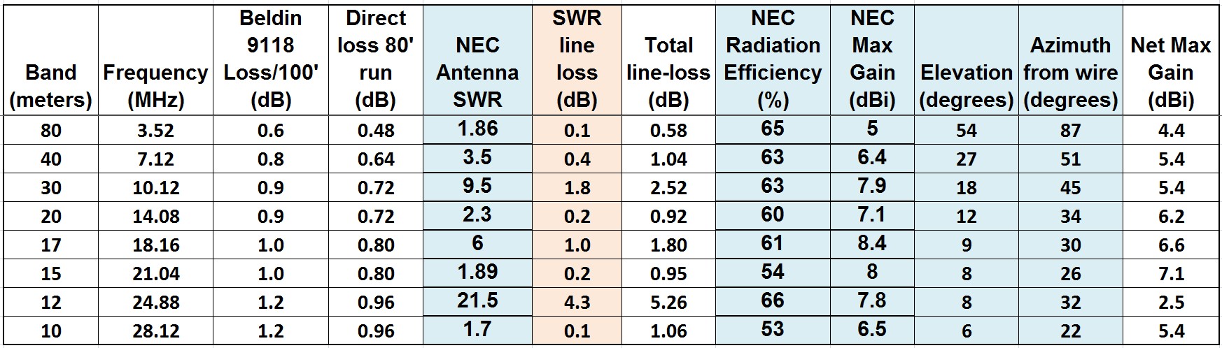 You can see the band resonances on the SWR-300 Ω plot.  Portions of the 80m, 20m, 15m, and 10m bands could be used without a tuner if you have a 75 Ω transmitter, but our plan is to match with an antenna tuner at the transmitter anyway.  The antenna tuner will ensure that reflected power returning from the antenna will not be sent along to the 50 Ω transmitter.  Hence, any power reflected from the antenna must be re-reflected back to the antenna again at the tuner.  If there were no resistive losses in the feed components, we wouldn’t care at all about the SWR, since eventually all of the power would be radiated from the antenna after several bounces back and forth to the tuner.  But there are fintie losses in the cable, so too many reflections will sap transmitter power.  A good discussion of line losses and SWR can be found in this 2006 QST article. The numbers in the brown shaded column in the table below come are derived from a graph in that article. The table also shows some of the numbers from the NEC model runs (shaded blue) for each ham band.