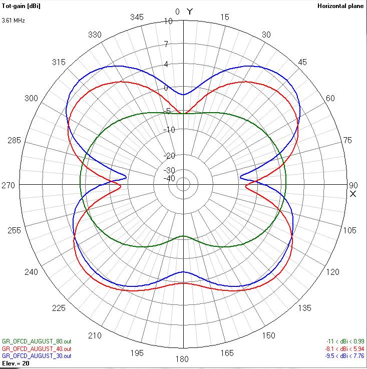 Horizontal pattern for three low bands. 80m Green, 40m Red, 30m Blue