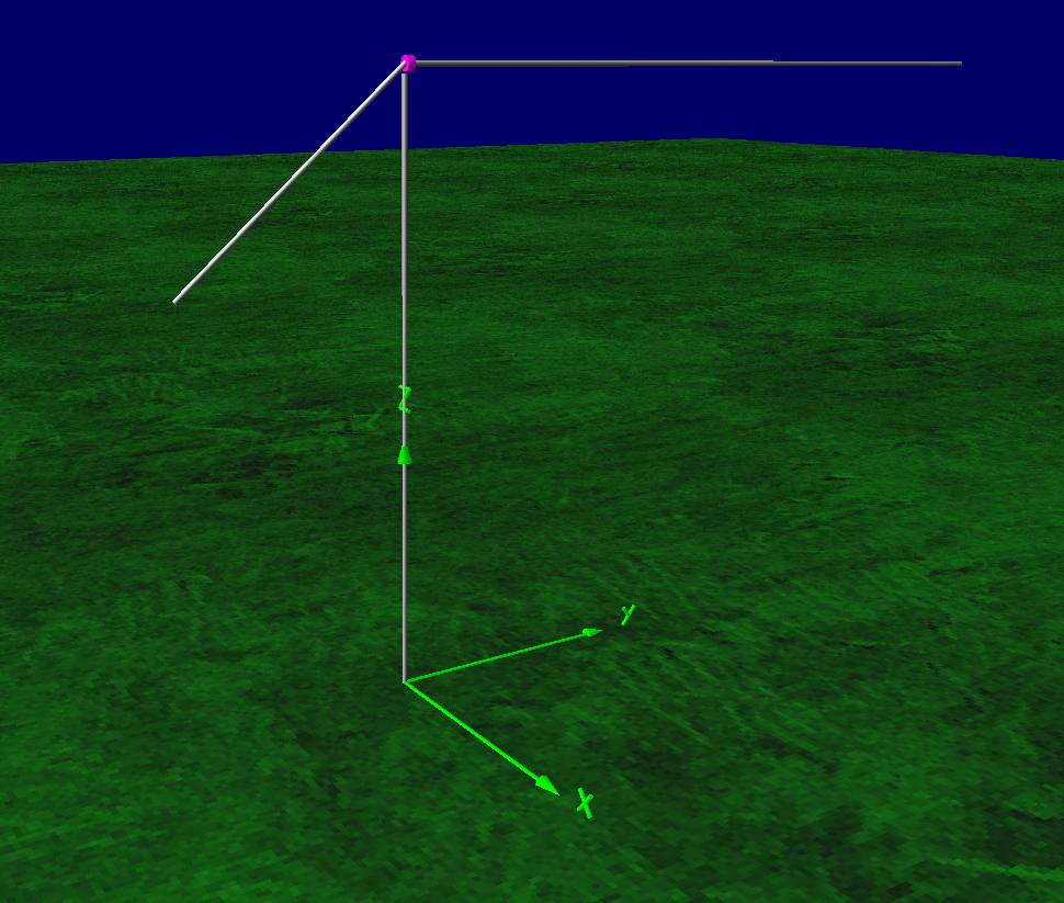 I had tall support points in the trees for the feed point and the far end of the long wire.  The short wire would be pulled down to a lower fastening point.  The model, shown in the figure on the right, includes the feed coax.  The feed is not connected to either main element since a balun is used to drive the dipole.  However, it is an easy matter to connect the vertical feed line to one side or the other and add a choke somewhere on the feed to get yet more interesting resonances.  Such tricks are employed with “Carolina Windom” antennas.  My model runs suggests only minimal changes if you connect up a vertical element so we will not further consider this modification here.  As-is, the vertical cable run is not particularly resonant with any band and has little effect whether it is included or not.