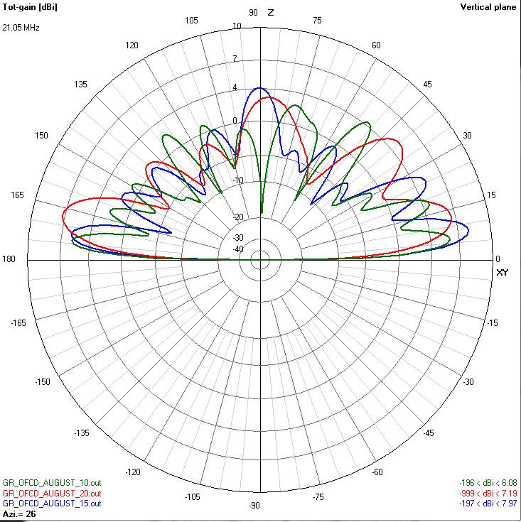 Horizontal pattern for three upper bands. 20m Red, 15m Blue, and 10m Green.
