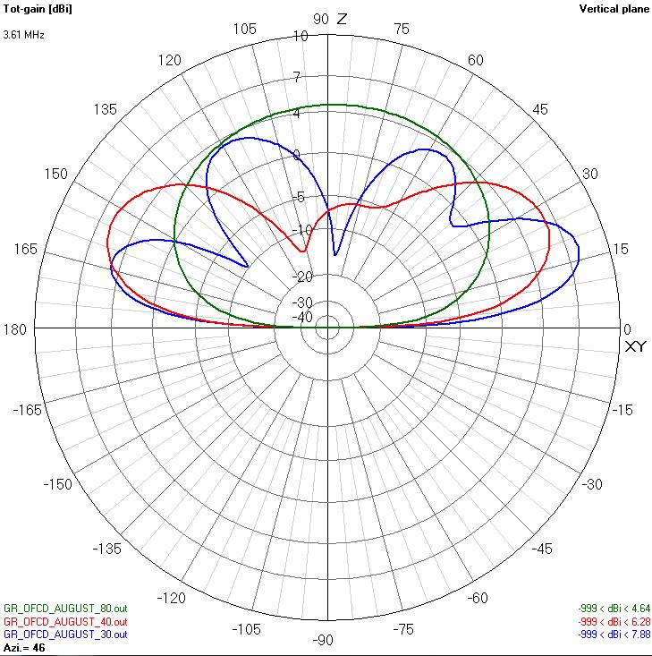 The table lists the maximum antenna gain for the low-elevation lobes.  Let us look at the radiation patterns that NEC2 gives us. Plots are the elevation and horizontal patterns for six of the bands supported on the antenna.