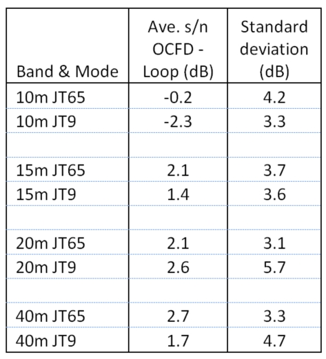 The graphs above shows the result after quite a bit of data manipulation in Excel. Remember that peaks in the above chart can come about because of either a strong transmission lobe for the OCFD antenna or because of a null on the Loop antenna. Many factors can give rise to a spread in the gain difference at a particular bearing angle. The actual propagation path for a particular transmission might be at any of a range of propagation elevation angles, all of which are it different for each antenna. The transmitters have unknown polarization and the antennas will respond differently according to the actual polarization vector. The radiation patterns I’ve presented are just the total gain and do not consider this added subtlety. Nevertheless, there are definitely directions that favor one antenna or the other.