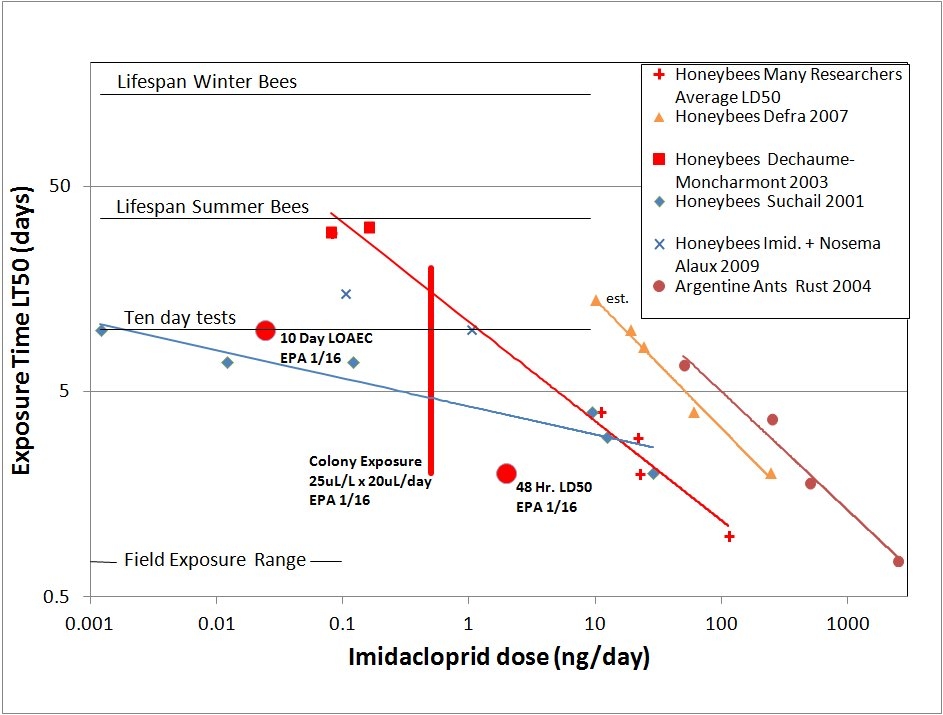 Indeed, the EPA has chosen the 10-day LOAEC and 48-h LD50 to be safely on the low side of most of the reported results in the literature. However, we feel that the colony level exposure of 25µg/L as determined from the Tier 2 study results should be viewed with much caution. The recommendation of <25µLa.i./L is shown as the red vertical line on the plot. Nectar consumed at 25µLa.i./L with typical daily consumption of 20µL/day yields a daily dose of 0.5ng a.i. per individual. A single day’s exposure, 0.5ng/bee, exceeds by a factor of 2 EPA’s accepted LOAEC of 0.24ng/bee. It is very hard to imagine that the cumulative dose to individual bees at this level of contamination would not give rise to neuro-toxic symptoms.