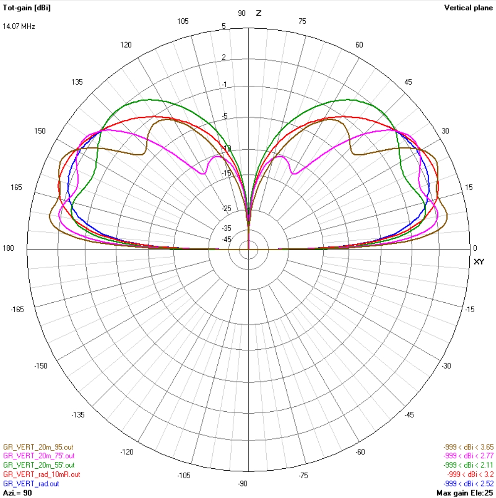 With vertical antennas, the ground model will have an enormous effect on the level of losses, far field radiation pattern, and gain. For comparison purposes, I use the 4NEC2’s “Average” “Real Ground” model. You will discover that it is difficult to get more than about 50% radiation efficiency with this model – but that is life with a vertical antenna!