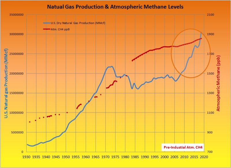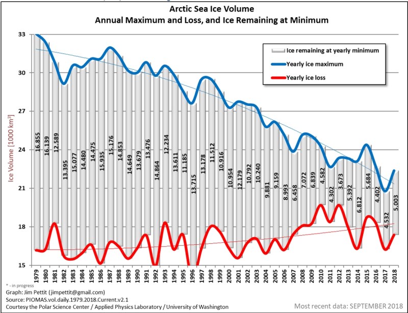 Ice isn’t the only problem up north; we can’t forget the methane. Good data on methane levels started being collected in 1983. Methane levels are much lower than CO2 levels and methane has a half-life in the atmosphere of a dozen years or so, but the gas does about 30 times the greenhouse heating compared with CO2 so its a good idea to keep an eye on it. Methane was steadily increasing from ancestral levels (~680 ppb) until about 1999 when it leveled off for about ten years at about 1770 ppb. However in the last few years it has resumed it’s steady march upward, now at 1870 ppm and so being equivalent to about 32 ppm of CO2 warming potential.2 There is good and bad news about this. The good news is that the relatively short lifetime in the atmosphere of this gas means that there is hope to get rid of it by stopping leaks and preventing local emissions. To that end, there is a brand new satellite that gives data at much better resolution coming on line that will help in pinpointing the emission sources.3 The bad news is that the Arctic permafrost is collapsing in a dramatic fashion. Rather than gradually thawing, a few inches at a time, entire sections of ground are collapsing and turning to muck.4,5 Exactly how this is effecting the release of greenhouse gasses is not well understood because this is a brand new and unexpected phenomenon. An alternative explanation for the recent upturn in methane emissions is fracking.6 Production of natural gas increased greatly because of this technology that started coming on line around 2005, roughly the same time atmospheric methane started to rise again.