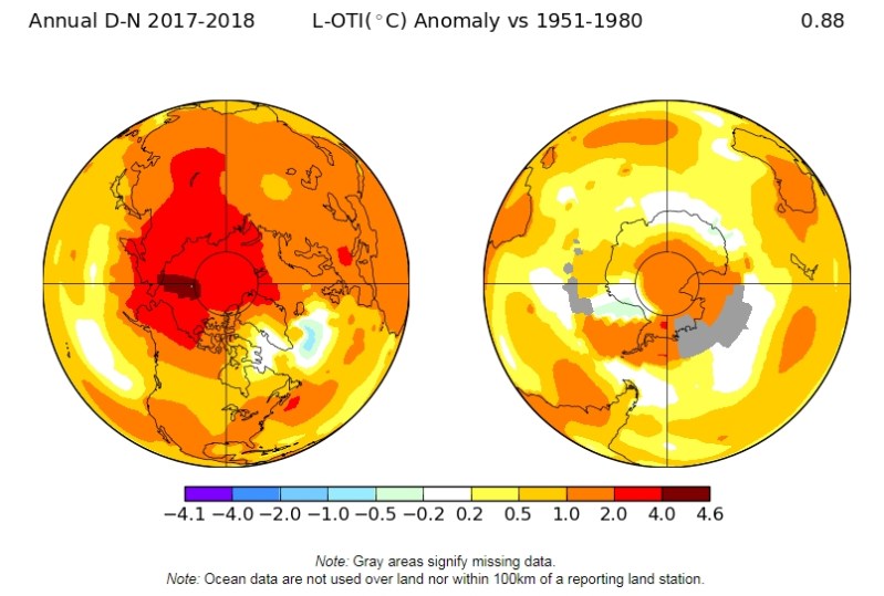 Global temperatures have increased, but not nearly as dramatically as the present day CO2 level suggests is possible and coming. In the north, we find increases of 1° to 4.5° C with concentrated warming at the pole; in the south 0.5° to 2° C again warmer at the pole. Overall, the consensus is that the world has warmed a little more than 1° C. The potential heating I mention above is not nearly manifest yet. But what you can see from the graph of global average temperatures is that we are now an a fairly steady uptick. The train is rolling.