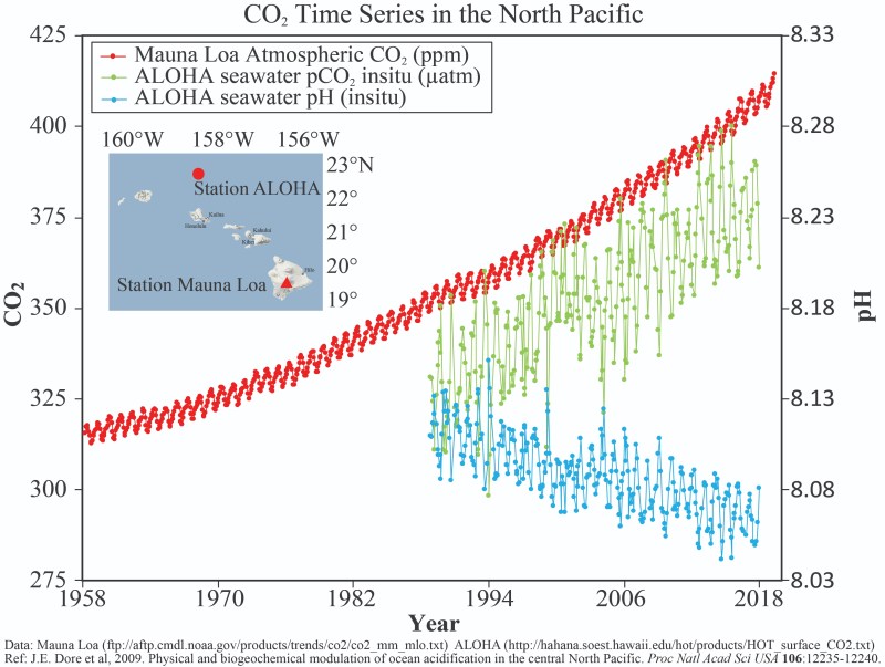 Nature will take care of everything eventually. Once the earth heats up sufficiently, the radiative losses through our warming CO2 blanket will become as large as the input radiation from the sun and the earth will not get any warmer. In the shorter term, it appears to me that we are approaching the point where the earth is releasing as much carbon into the atmosphere as humans are by burning fossil fuels. This is the tipping point we are all worried about and it seems inevitable, especially seeing Siberia and Brazil burning this year. We will know for sure when this happens as the Mauna Loa CO2 graph kicks upward despite our best efforts to reduce emissions. We argued above that natural rates of emissions during prehistoric warming events were 10 times slower than the present cycle, and so we might expect that dramatically cutting anthropomorphic emissions would significantly slow even a run-away natural event. So don’t get me wrong — even if we are past the tipping point, we need to stop burning fossil carbon today! In the long run, we have to start pulling the carbon out of the air, but that is a lot harder than not putting it there in the first place. Eventually, the oceans could be our savior if we don’t tip them towards our extinction.