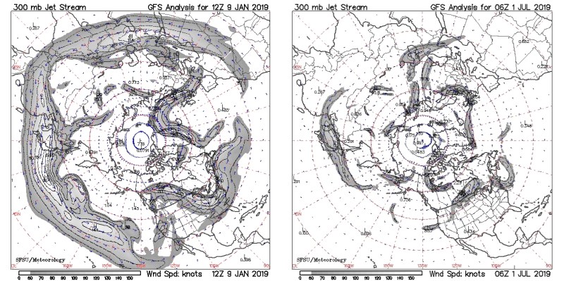 The figures above compare the jet stream in winter and summer for the norther and southern hemisphere. What you notice immediately is that the winter jet stream is much stronger than in the summer. The polar antarctic temperature gradient maintains an organized jet stream in the summer while in the north the jet stream disintegrates into turbulent tangled circulation. The archived maps and animations going back to 2015, never show very organized summer jet streams up north. This has always been the case, but it is possible to measure statistical changes the jet stream behavior over time.7,8 Troute et.al., attempts to compare shifts in jet stream location and variability by looking at local temperature changes in Britain and the Mediterranean using three centuries tree ring data as the proxy. They discover, indeed, an increase in inter-annual variability in the jet stream latitude that has increased in the late 20th century. They also note that some models suggest a general “waver” of the jet stream on sub-annual time scales but more rapid motion of the jet on daily time scales as the world heats up. What I see is a slowing down jet which becomes “frothy.” In the last few years, we’ve seen winter storms appearing in the eastern U.S. as the more organized winter jet begins to break up in the spring. In Europe it has been common for extreme heat waves to strike early in the summer. It is uncertain to me how this effect scales as the temperatures rise.