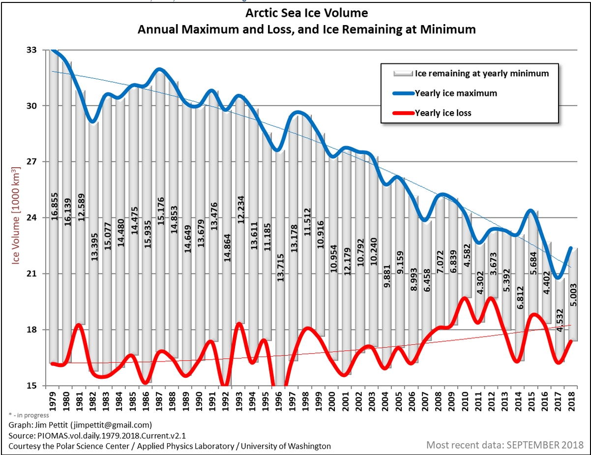 Lets do the thought experiment about decadal versus millennial time scales. It is estimated that about 25% of the land area was covered in ice during the glacial maximum periods. This is about 37 x 106 sq km of ice, of which all but 15 x 106 sq km melted during the warming phase. Hence, during a 4000 year warming cycle, of order 5.5 x 103 sq km of new ground is appearing annually. If you look at the ice extent chart above, you can see that about 2 x 106 sq km of ice has gone missing over the last 50 years, about 40 x 103 sq km of ice per year. So we are burning through the ice an order of magnitude faster than ever before (although not quite fair because I’m comparing land ice with sea ice).