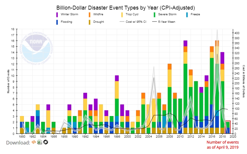 NOAA compiles a list of Billion-Dollar disasters of all types. In the last two decades the frequency and cost of these events have increased dramatically. Severe storms are the billion-dollar disasters that have increased the most. Catastrophic flooding and fires have also become much more common.