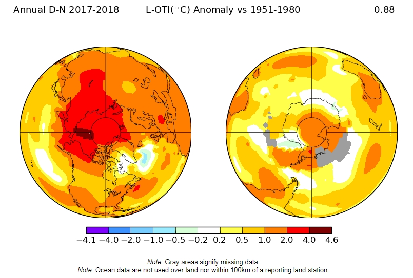 Global temperatures have increased, but not nearly as dramatically as the present day CO2 level suggests is possible and coming. In the north, we find increases of 1° to 4.5° C with concentrated warming at the pole; in the south 0.5° to 2° C again warmer at the pole. Overall, the consensus is that the world has warmed a little more than 1° C. The potential heating I mention above is not nearly manifest yet. But what you can see from the graph of global average temperatures is that we are now an a fairly steady uptick. The train is rolling.