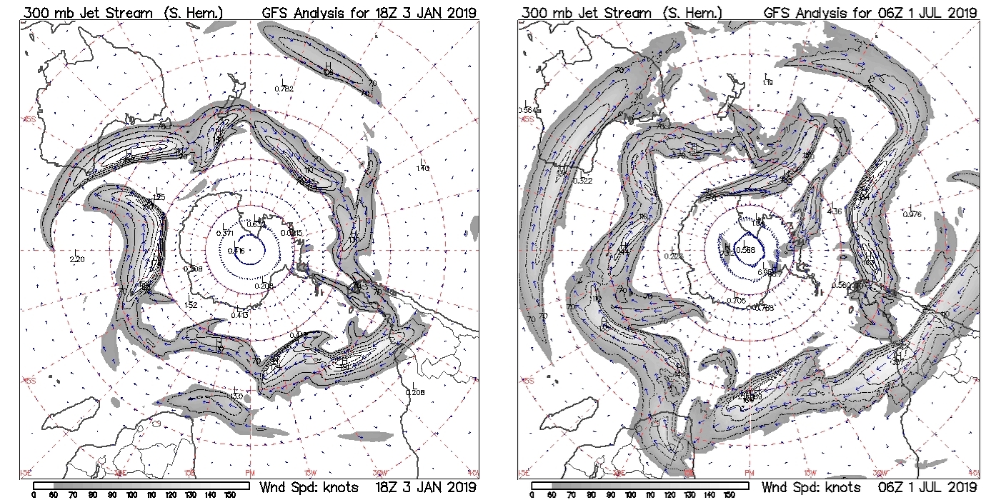 The figures above compare the jet stream in winter and summer for the norther and southern hemisphere. What you notice immediately is that the winter jet stream is much stronger than in the summer. The polar antarctic temperature gradient maintains an organized jet stream in the summer while in the north the jet stream disintegrates into turbulent tangled circulation. The archived maps and animations going back to 2015, never show very organized summer jet streams up north. This has always been the case, but it is possible to measure statistical changes the jet stream behavior over time.7,8 Troute et.al., attempts to compare shifts in jet stream location and variability by looking at local temperature changes in Britain and the Mediterranean using three centuries tree ring data as the proxy. They discover, indeed, an increase in inter-annual variability in the jet stream latitude that has increased in the late 20th century. They also note that some models suggest a general “waver” of the jet stream on sub-annual time scales but more rapid motion of the jet on daily time scales as the world heats up. What I see is a slowing down jet which becomes “frothy.” In the last few years, we’ve seen winter storms appearing in the eastern U.S. as the more organized winter jet begins to break up in the spring. In Europe it has been common for extreme heat waves to strike early in the summer. It is uncertain to me how this effect scales as the temperatures rise.
