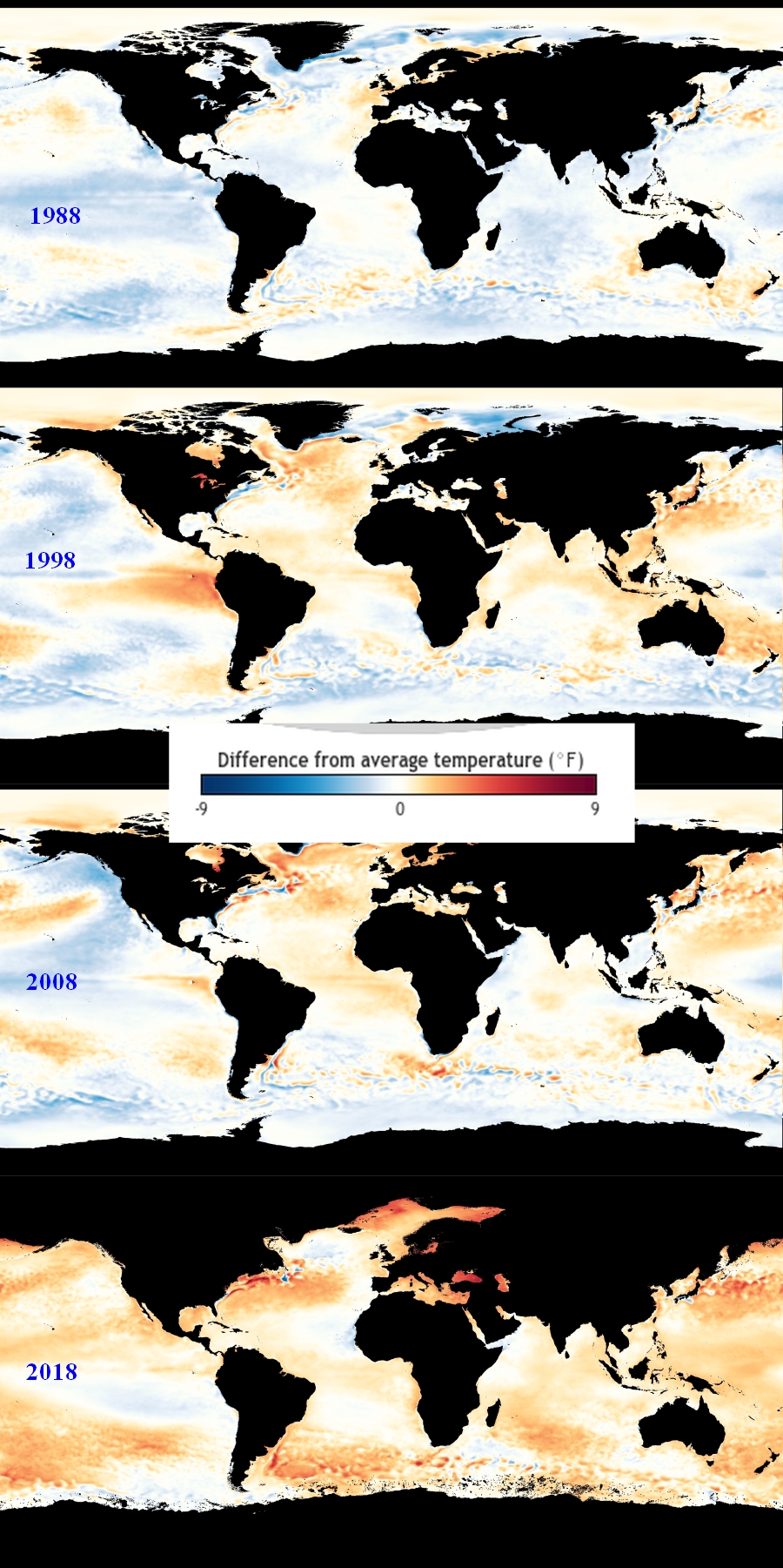 The yearly averages a decade apart show the inexorable trend accelerating. With virtually no place with below average sea temperatures, what used to be normal is now as cold as it gets. The Caspian and Black seas are gasping as the Mideast begins the march towards the inhospitable.