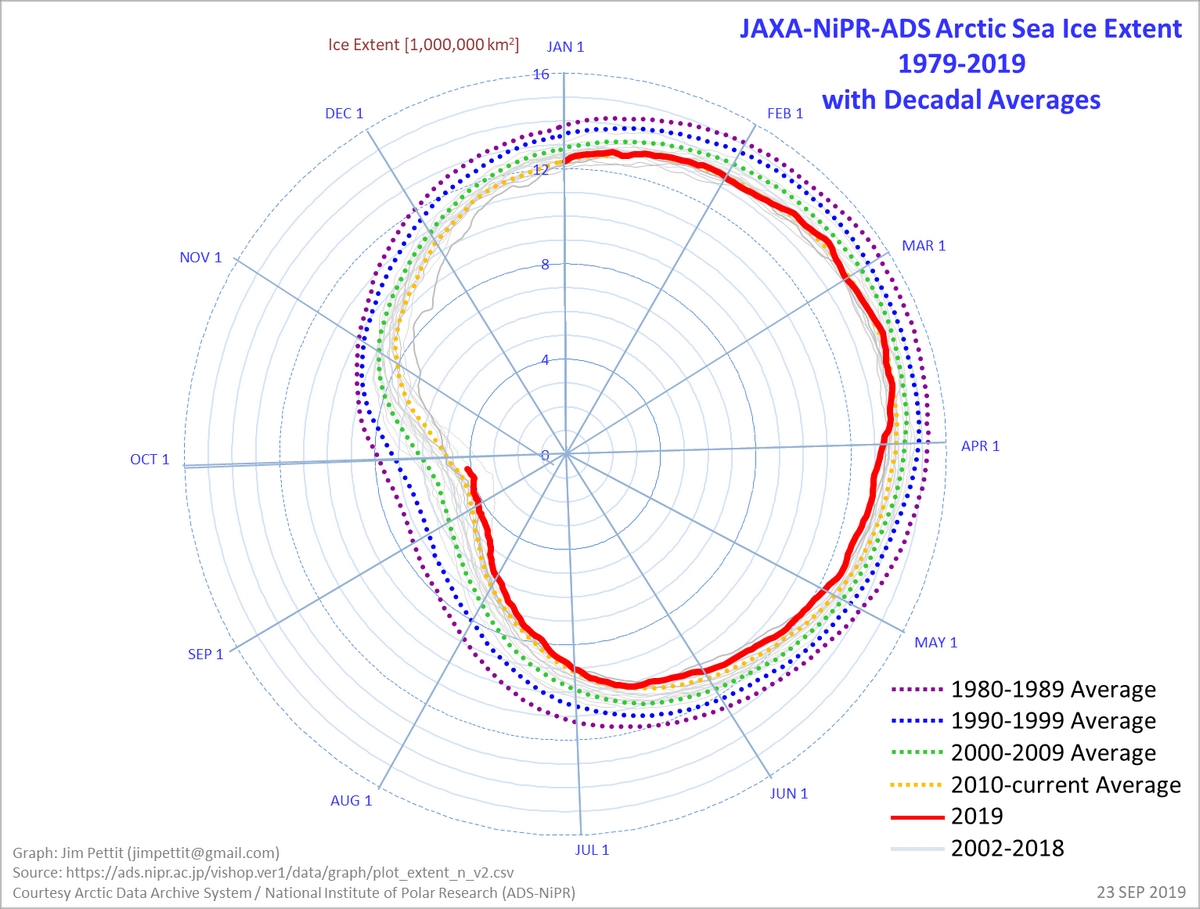 The northern hemisphere is much more reactive than the southern one to climate change, as born out by the Arctic and Antarctic Ice core data. Land under the Antarctic continent keeps the ice sheet stable and insulated from ocean waters, unlike the floating ice sheets in the Arctic ocean. Warming in the north melts the ice sheet, exposing more open water which efficiently absorbs solar radiation. This volatile effect is well underway in our current episode of climate heating. Relatively rapid changes in sea ice extent are evident. Recent years, this one included, are attempting to set records for the smallest patch of remaining sea ice. The graph below shows whats happening. The decreasing area in the 1980’s and 1990’s was not too significant, but by the 2000’s especially in the summer, the increase in blue water in the arctic is very significant and is likely a driver for some of the severe weather has become the norm in the last decade.