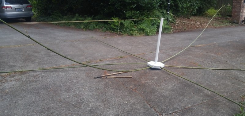 The bamboo Moxon I built for the 20 meter band earlier this summer convinced me of the power of compact two element antennas. When I was showing the Moxon to a friend, he pointed up to a nearby tree and said “There’s the place to pull from,” pointing to the crotch of a tall branching ash tree in the midst of a few Douglas fir trees. The seed for the hex beam was planted. With one bamboo antenna under my belt, it seemed that doing another with the experienced previously gained would behoove me.