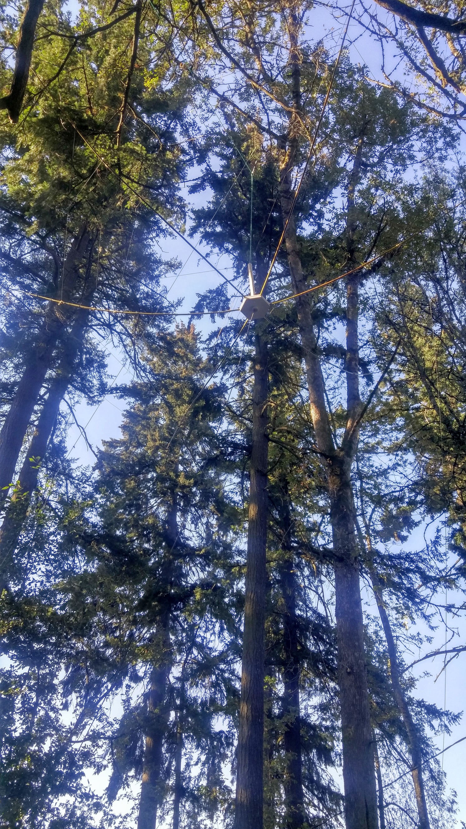 Getting the hex beam up into the trees was its own adventure. I needed to trim a few branches that were thirty five feet in the air and I was not inclined to go after them with ladder and chain saw. I devised a “rope saw” from an old chainsaw chain and, with difficulty, removed the worst offenders while standing on the ground. Still, to get the antenna all the way up takes swinging it between obstructing branches and ropes. I fastened cords to three of the bamboo poles that drop all the way to the ground so that I can tilt and pull and steer the antenna as it is pulled into position. Fortunately it clears some of the worst branches once it is above thirty feet, and the cords let me point the antenna in the direction I would like to listen without needing to lower it down.