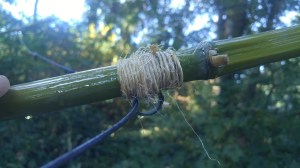 The wire hangers again used inexpensive garden materials. I have a ball of twine and I cut up a piece of 5/8 poly irrigation tubing into loops for the wire hangers. I lashed the poly loops to the bamboo spreaders at the correct location out from the center. There is not much to making these lashings; the main thing is to get them started so they do not release. if you flip the ends “under two” loops, they will lock in pretty well.