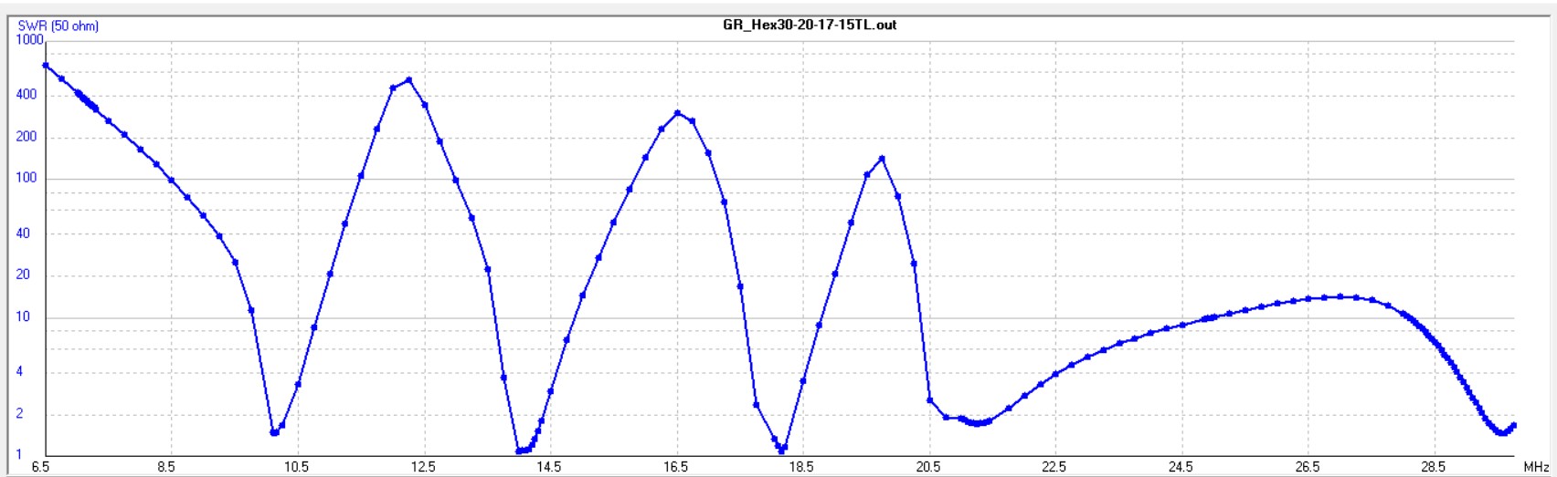 The hex beam is fairly well established with a mature design at this point. For a starting place I used the dimensions for the G3TXQ version of the hex described here by K4KIO, and of course I built a 4NEC2 hex beam model. The referenced dimensions worked very well in the model, which gave confidence to scale up for the 30 meter element as well. The 30 meter wire lengths were scaled by the ratio of design frequencies, 14.1/10.1, from the wire lengths for the 20 meter band. The one fly in the ointment for my installation is that the only good feed line I have is 75Ω coax. For this multi-band matching problem, 50Ω line is best because the hex geometry matches well to 50Ω on all of the bands. I spent some time trying to find special compensation for the lengths of the wire elements and a particular feed line length to make the 75Ω cable work, but in the end – nothing did. As is, I have to use a tuner on a couple of bands. None of this is dire, but given the choice, pick 50Ω cable. You can see the nice multi-band match that is possible in the plot below.