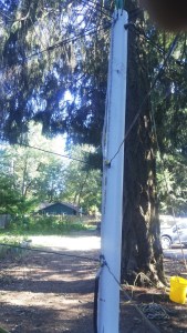 The wire elements are cut to length with O-lugs attached to the ends of the wires. The spacing between the driven element and the reflector is taken up with a length of cord tied between the wires, one for each half of the driven element. I drilled a pair pilot holes for sheet metal screws in the central PVC pillar at the heights for each of the bands so that the ends of the driven elements had an anchor. The wire element assemblies are threaded through the hangers with the ends terminating at the central pillar. The tension of the wires will tend to open the front facing spreaders so those two poles are held together with another piece of parachute cord.