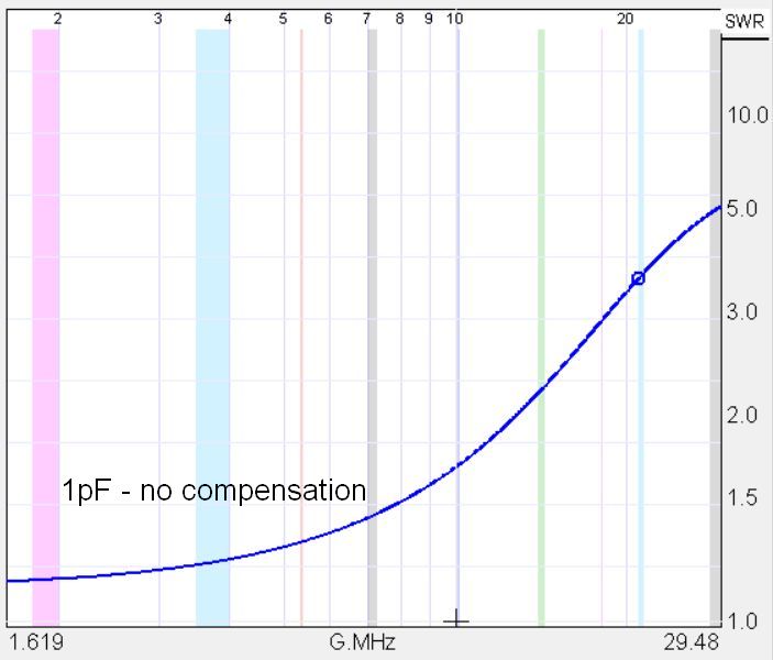The capacitor C2 on the generator-side is the compensation capacitance. (SimSmith works from the load on the left to the source on the right) For high frequencies L1, the magnetization inductance, can be ignored and we are left with a little pi network consisting of the winding capacitance, C1, the leakage inductance, L3, and the added compensation capacitor C2. The figure below shows the effect of adding capacitor C2.