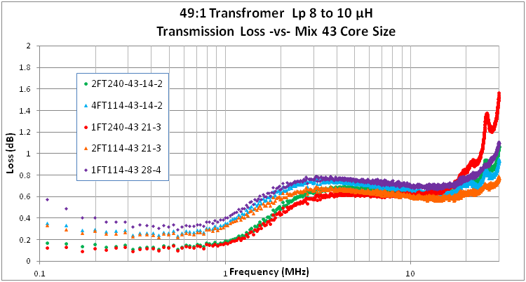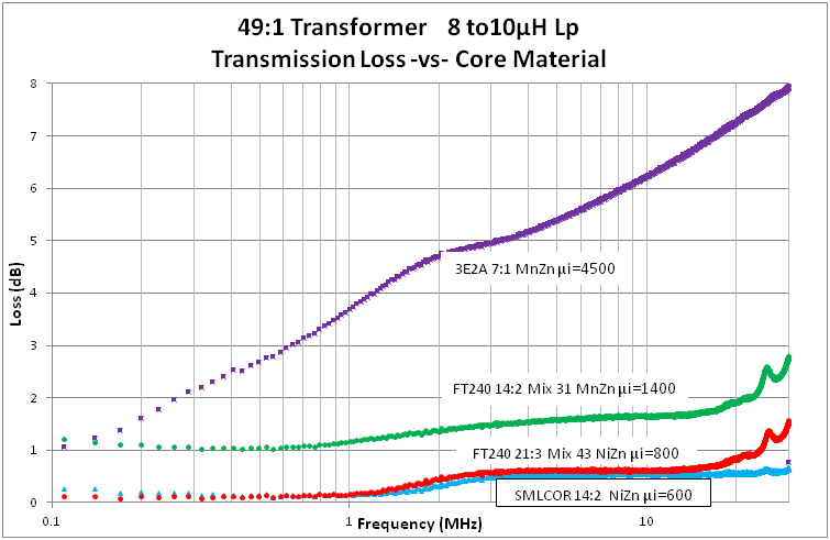 Again I built transformers from the cores of these other materials such that the primary inductance was as close to 8µH as I could make it. And again I measured the primary inductance, leakage inductance, and losses using the NanoVNA. The characteristics of these transformers are listed in the last three rows of the table. The chart below compares the transmission loss for transformers made with these various core materials.