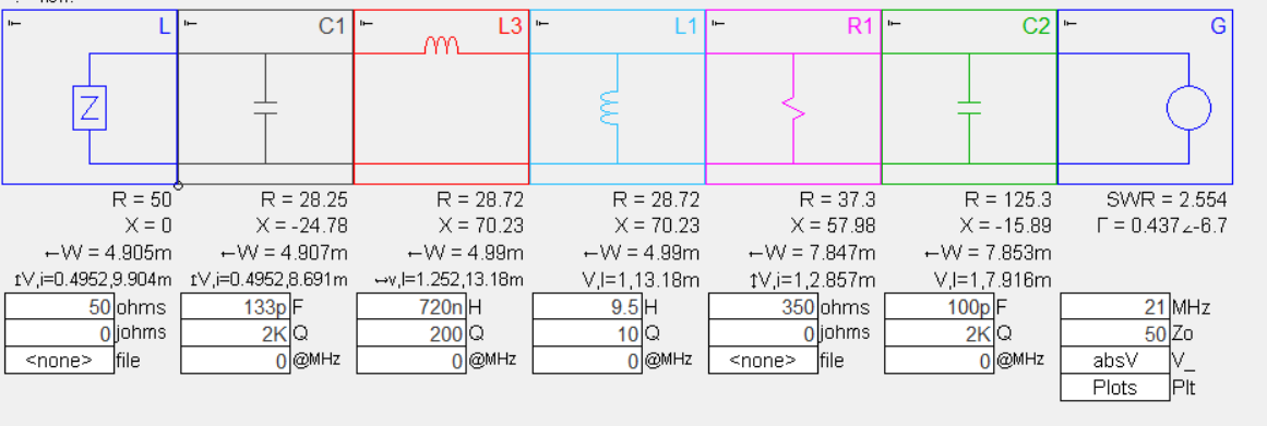 I found the SimSmith program to be very handy to see what is going on when applied to a primary-referred circuit model. Below is the SimSmith model that uses the leakage and magnetization inductance and the primary-referred capacitance obtained a 500kHz for the FT240-43 21:3 transformer that we used in the studies above.