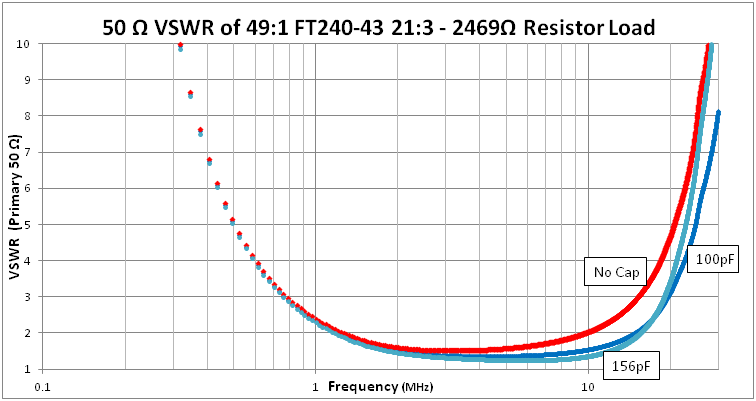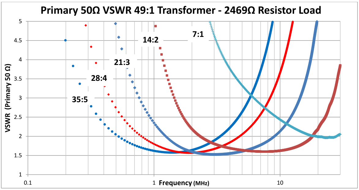 For the next step I connected the network analyzer’s S21 port to the secondary of the transformer through a 2400 Ω resistor (it was actually 2469 Ω). The resistor and the analyzer’s input impedance provide a nominally matched load for the 49:1 impedance transformation in the transformer. The S11 reflection can tell us the VSWR of the transformer with the resistive match. The figure below shows the VSWR plots for the five transformers.