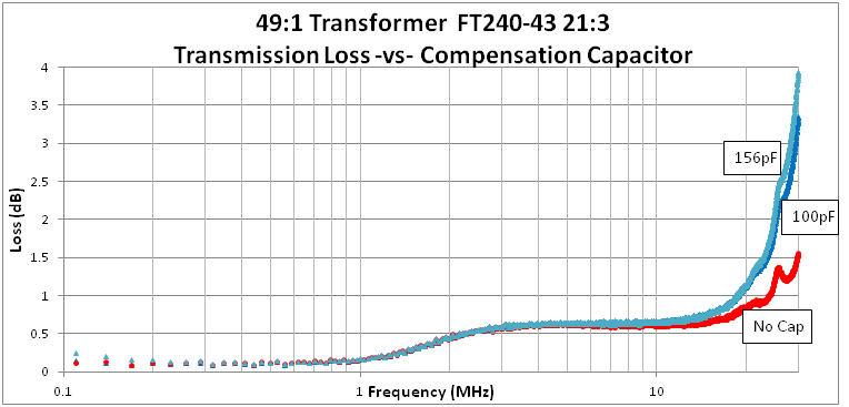Qualitatively we see the same behavior as with the SimSmith model. However, the upper end cutoff seems to be coming a little lower infrequency. Most likely this is because SimSmith knows nothing about the nonlinear core material we are dealing with which rears its head above 10MHz. In fact, it you look at transmission losses which include the compensation capacitor, you discover that the capacitor enhances core heating at the high frequencies. The better match of the source provided by the compensation capacitor allows more energy to be delivered to the core rather than reflected back to the source. We have a double edge sword here!
