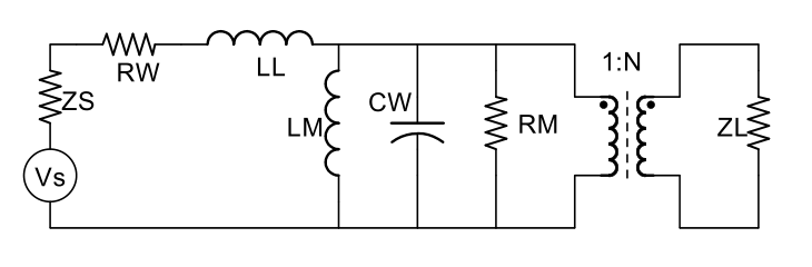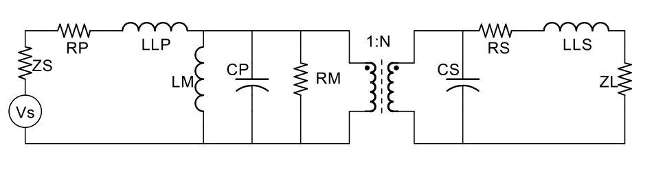 Besides the ideal transformer, there are leakage inductances LLP and LLS that result from imperfect flux coupling. The winding resistance for the primary and secondary are RP and RS respectively. The magnetization inductance, LM, is associated with filling the core with magnetic flux that is required for the ideal transformer action to take place. (Note that in the ideal transformer the amp-turns on the primary and secondary are exactly balanced so no net magnetic field would appear in the core.) Winding capacitance is modeled as CP and CS. The secondary-side parasitic elements can be transferred to the primary side of the transformer, with appropriate scaling by the turns ratio squared, they can be combined with the primary-side parasitics. In the simplified primary-referred model below, CW = CP + N2 CS ; and approximately RW = RP + RS/N2 and LL = LLP + LLS/N2 .
