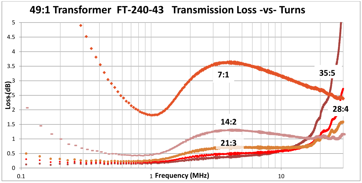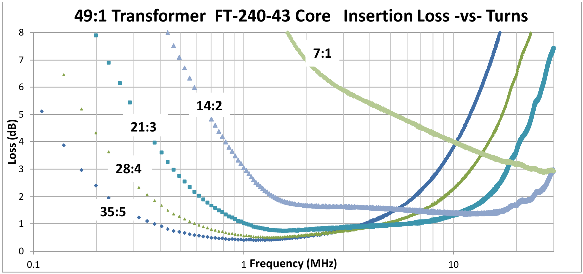 One question I wanted to answer was the optimum number of turns for a 49:1 impedance transformer. I wound several transformers on an FT240-43 core with 7, 14, 21, 28, & 35 total turns. The transformers were wound as auto-transformers with the primary tapped with a 7:1 turns ratio, so primary turns of 1, 2, 3, 4, & 5 turns respectively.