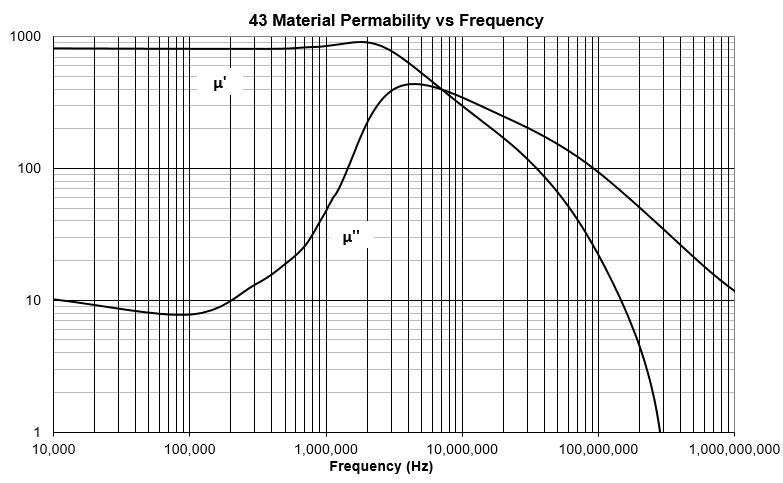 One can verify with NEC models that, indeed as is conventional wisdom, an end-fed driving impedance of about 2450Ω works well to drive the antenna wire (see the companion post Engineering the EFWH 49:1 Transformer and Antenna). This implies a 49:1 impedance transformation from 50Ω, so a turns ratio of 7:1 is required for the transformer. Typical end-fed antennas are supposed to work on multiple ham bands, so the transformers must be broadband. The ferrite material characteristics will have a large influence over the frequency range where the transformer will perform well. For this application the NiZn ferrite mix 43 is often used because of its high resistivity and low core losses at high frequencies. I happened to have several cores of various sizes of this material, so this was the starting point for my investigations. Mix 43 has an initial permeability of about 850; the complete frequency dependence is shown below.