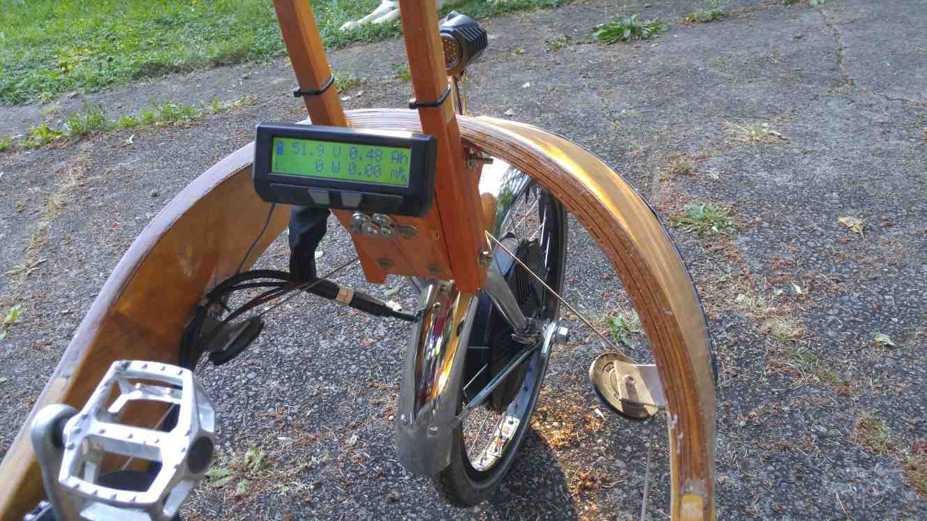 The motor is controlled by a thumb-activated throttle located on the steering tiller. In addition I added a magnetic sensor to the brake lever to activate the regenerative electric brake on the front wheel. The Cycle Analyst display mounted to the trike frame shows the battery charge state, motor power, motor temperature, speed and trip mileage. It also keeps track of battery performance and life and total mileage as long as the device is reset after every battery recharge.